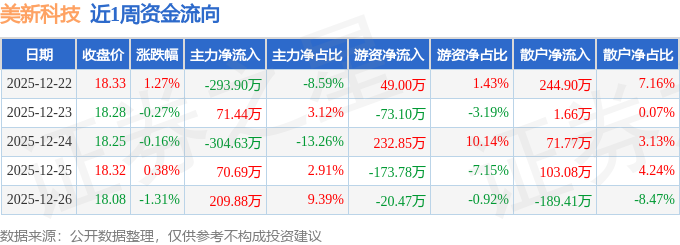 资金流向数据方面,本周美新科技主力资金合计净流出246.51万元,游资资金合计净流入14.51万元,散户资金合计净流入232.0万元。本周资金流向一览见下表: