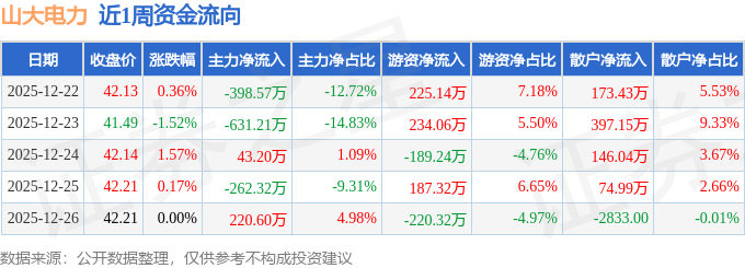 资金流向数据方面,本周山大电力主力资金合计净流出1028.3万元,游资资金合计净流入236.97万元,散户资金合计净流入791.33万元。本周资金流向一览见下表: