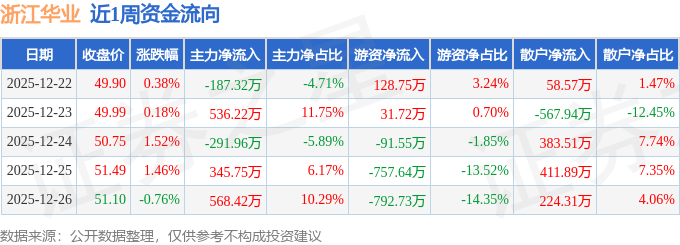 资金流向数据方面,本周浙江华业主力资金合计净流入971.12万元,游资资金合计净流出1481.45万元,散户资金合计净流入510.34万元。本周资金流向一览见下表: