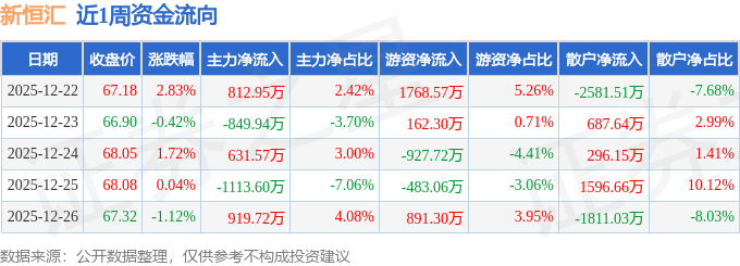 资金流向数据方面,本周新恒汇主力资金合计净流入400.7万元,游资资金合计净流入1411.39万元,散户资金合计净流出1812.09万元。本周资金流向一览见下表: