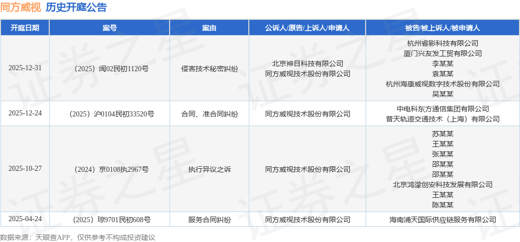 案号:(2025)闽02民初1120号根据统计,近一年内以同方威视技术股份有限公司为当事人的历史开庭公告有4则,其中案由为“侵害技术秘密纠纷”的公告以1则居首,其次为“合同、准合同纠纷”有1则,“执行异议之诉”有1则。历史开庭公告如下: