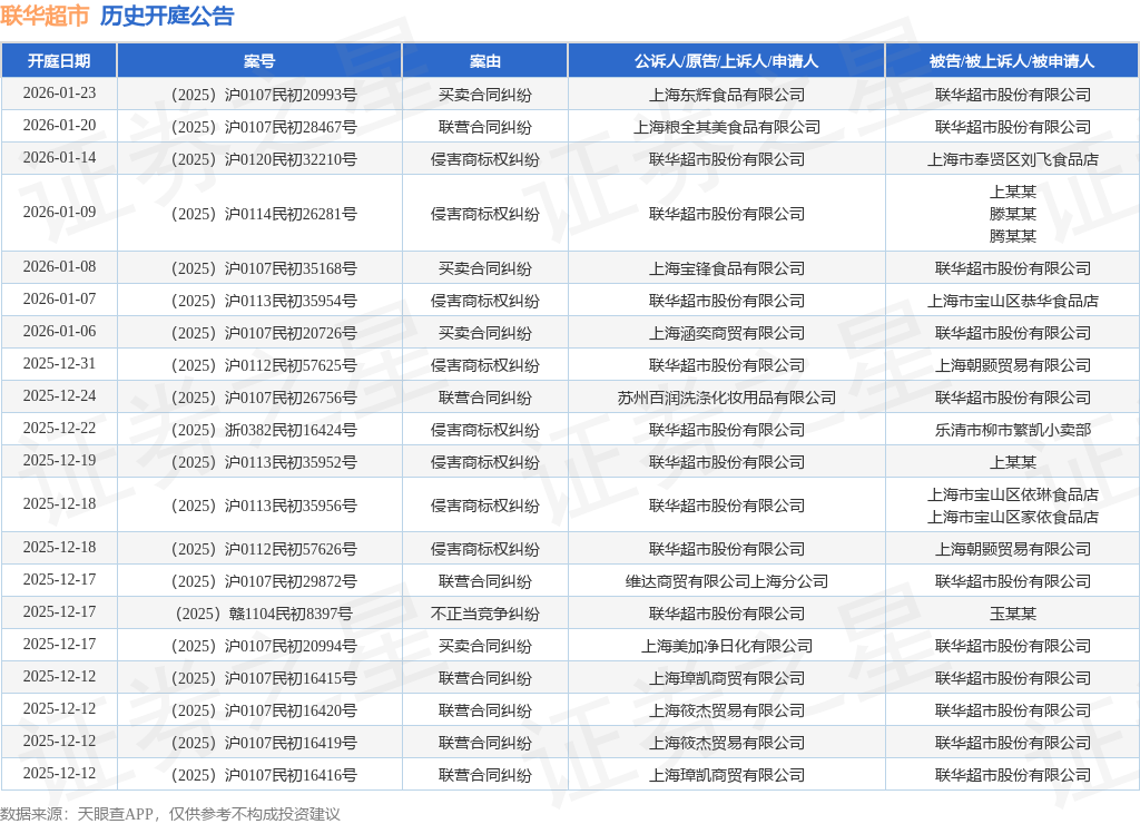 案号:(2025)沪0112民初57625号根据统计,近一年内以联华超市股份有限公司为当事人的历史开庭公告有130则,其中案由为“侵害商标权纠纷”的公告以67则居首,其次为“联营合同纠纷”有17则,“买卖合同纠纷”有15则。历史开庭公告(前20条)如下: