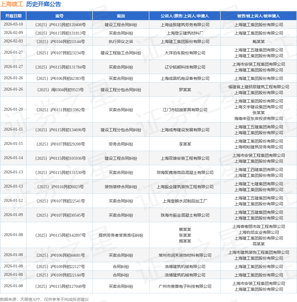 案号:(2025)浙0921民初2243号根据统计,近一年内以上海建工集团股份有限公司为当事人的历史开庭公告有460则,其中案由为“买卖合同纠纷”的公告以121则居首,其次为“建设工程施工合同纠纷”有85则,“案外人执行异议之诉”有48则。历史开庭公告(前20条)如下: