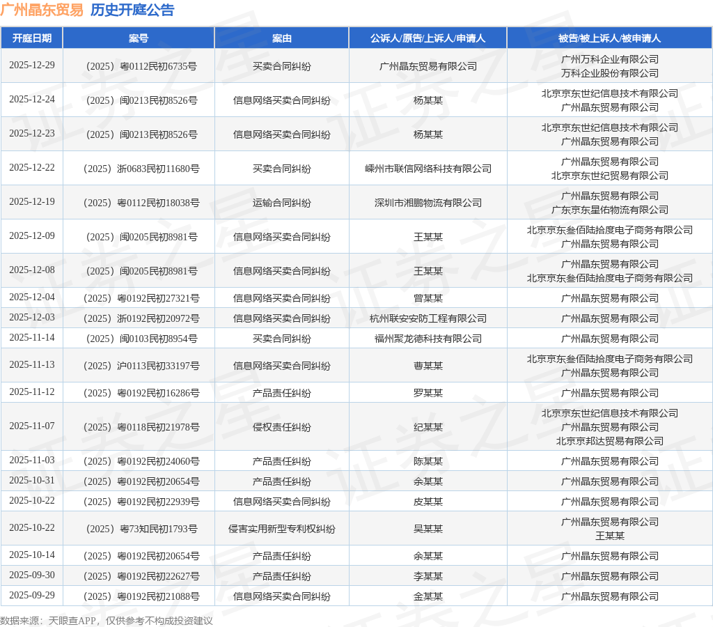案号:(2025)粤0112民初6735号根据统计,近一年内以广州晶东贸易有限公司为当事人的历史开庭公告有135则,其中案由为“信息网络买卖合同纠纷”的公告以49则居首,其次为“买卖合同纠纷”有34则,“产品责任纠纷”有21则。历史开庭公告(前20条)如下: