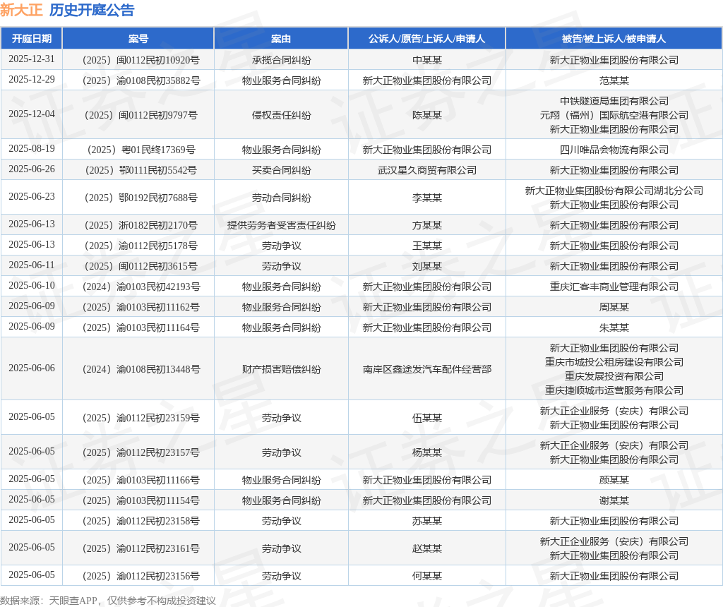 案号:(2025)闽0112民初10920号根据统计,近一年内以新大正物业集团股份有限公司为当事人的历史开庭公告有73则,其中案由为“物业服务合同纠纷”的公告以26则居首,其次为“服务合同纠纷”有21则,“劳动争议”有10则。历史开庭公告(前20条)如下: