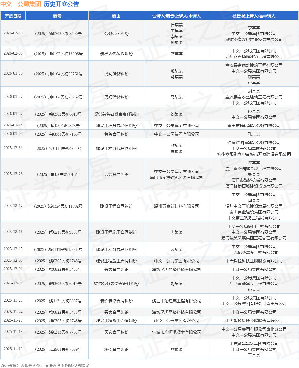 证券之星消息,根据天眼查APP显示,近日公布了一则中交一公局集团有限公司作为被告/被上诉人的开庭公告,详细内容如下:
