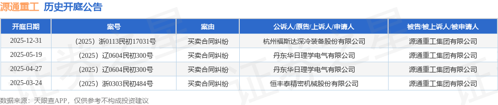 根据统计,近一年内以源通重工集团有限公司为当事人的历史开庭公告有4则,其中案由为“买卖合同纠纷”的公告以4则居首。历史开庭公告如下: