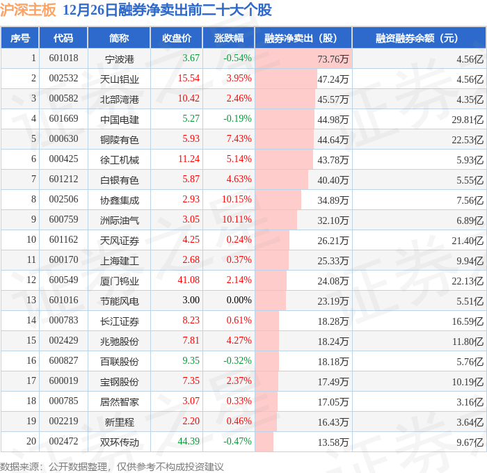 沪深主板融券净卖出前三分别为:宁波港(601018)融券净卖出73.76万股、天山铝业(002532)融券净卖出47.24万股、北部湾港(000582)融券净卖出45.57万股,前20具体见下表:
