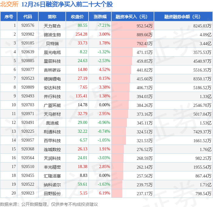 北交所融资净买入前三分别为:天力复合(920576)融资净买入952.54万元、锦波生物(920982)融资净买入889.66万元、贝特瑞(920185)融资净买入792.43万元,前20具体见下表: