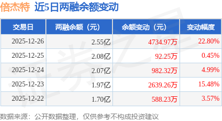 证券之星消息,12月26日,倍杰特(300774)融资买入1.04亿元,融资偿还5694.83万元,融资净买入4734.97万元,融资余额2.55亿元,近3个交易日已连续净买入累计5809.54万元,近20个交易日中有12个交易日出现融资净买入。