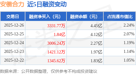 证券之星消息,12月26日,安徽合力(600761)融资买入1.64亿元,融资偿还1.3亿元,融资净买入3331.77万元,融资余额4.45亿元,近3个交易日已连续净买入累计2.48亿元。