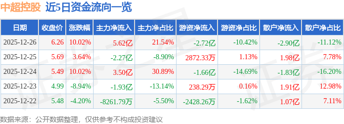 证券之星消息,截至2025年12月26日收盘,中超控股(002471)报收于6.26元,上涨10.02%,涨停,换手率31.85%,成交量427.67万手,成交额26.07亿元。