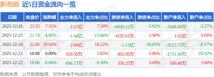 证券之星消息,截至2025年12月26日收盘,新劲刚(300629)报收于23.33元,上涨7.31%,换手率31.09%,成交量67.41万手,成交额15.45亿元。