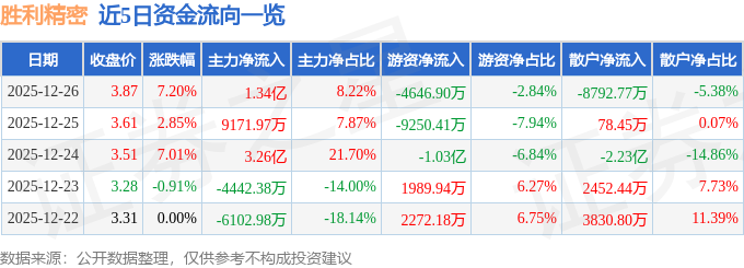 证券之星消息,截至2025年12月26日收盘,胜利精密(002426)报收于3.87元,上涨7.2%,换手率12.65%,成交量430.35万手,成交额16.34亿元。