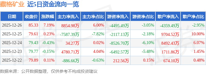 证券之星消息,截至2025年12月26日收盘,藏格矿业(000408)报收于85.33元,上涨7.19%,换手率1.13%,成交量17.68万手,成交额14.76亿元。
