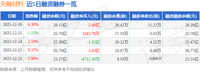 天赐材料融资融券信息显示,融资方面,当日融资买入8.61亿元,融资偿还6.16亿元,融资净买入2.44亿元,净买入额两市排名第10。融券方面,融券卖出11.5万股,融券偿还2700.0股,融券余量28.42万股,融券余额1299.93万元。融资融券余额28.28亿元。