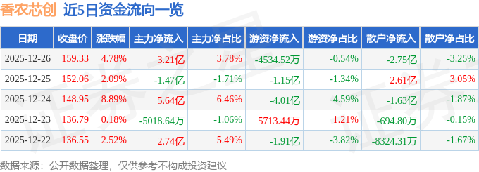 证券之星消息,截至2025年12月26日收盘,香农芯创(300475)报收于159.33元,上涨4.78%,换手率11.94%,成交量53.17万手,成交额84.72亿元。