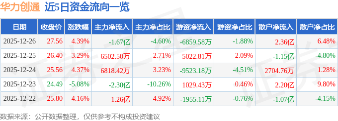 证券之星消息,截至2025年12月26日收盘,华力创通(300045)报收于27.56元,上涨4.39%,换手率25.47%,成交量131.5万手,成交额36.43亿元。