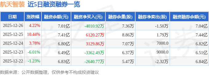 证券之星消息,截至2025年12月26日收盘,航天智装(300455)报收于30.65元,上涨4.22%,换手率14.99%,成交量106.2万手,成交额32.3亿元。