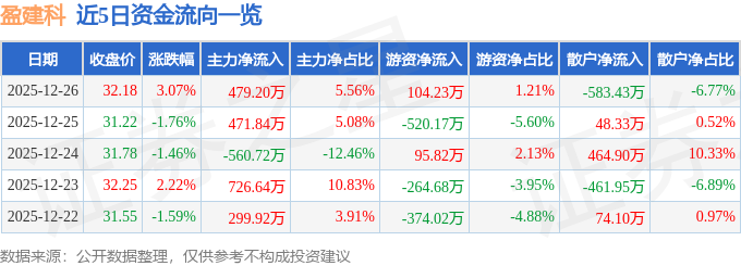 证券之星消息,截至2025年12月26日收盘,盈建科(300935)报收于32.18元,上涨3.07%,换手率4.48%,成交量2.7万手,成交额8612.4万元。