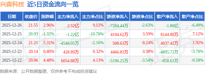 证券之星消息,截至2025年12月26日收盘,兴森科技(002436)报收于21.55元,上涨2.96%,换手率8.54%,成交量128.97万手,成交额27.68亿元。