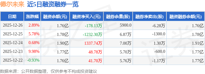 德尔未来融资融券信息显示,融资方面,当日融资买入2927.57万元,融资偿还3105.7万元,融资净偿还178.13万元。融券方面,融券卖出0.0股,融券偿还6.28万股,融券余量5900.0股,融券余额3.78万元。融资融券余额1.76亿元。