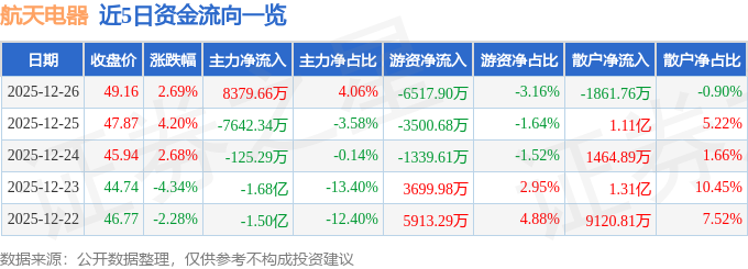 证券之星消息,截至2025年12月26日收盘,航天电器(002025)报收于49.16元,上涨2.69%,换手率9.31%,成交量42.27万手,成交额20.65亿元。