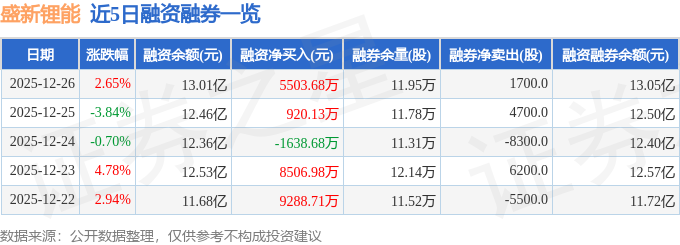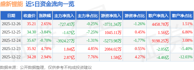 证券之星消息,截至2025年12月26日收盘,盛新锂能(002240)报收于35.21元,上涨2.65%,换手率9.13%,成交量83.33万手,成交额29.58亿元。