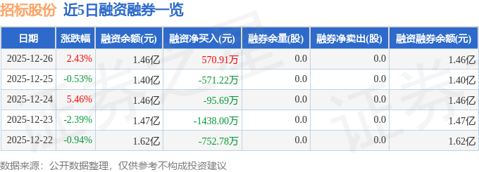 招标股份融资融券信息显示,融资方面,当日融资买入7155.44万元,融资偿还6584.53万元,融资净买入570.91万元。融券方面,融券卖出0.0股,融券偿还0.0股,融券余量0.0股,融券余额0.0万元。融资融券余额1.46亿元。
