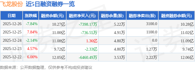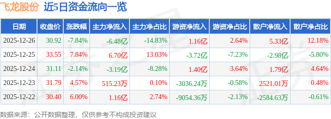 证券之星消息,截至2025年12月26日收盘,飞龙股份(002536)报收于30.92元,下跌7.84%,换手率25.33%,成交量137.92万手,成交额43.72亿元。