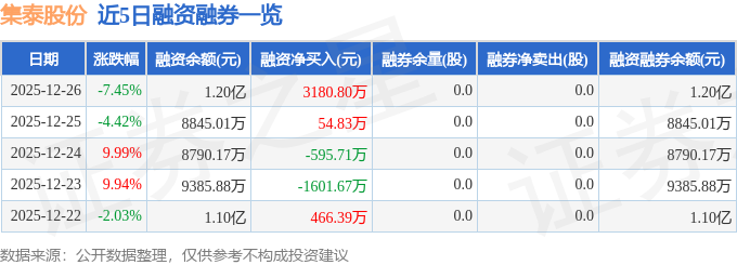 证券之星消息,截至2025年12月26日收盘,集泰股份(002909)报收于7.21元,下跌7.45%,换手率23.83%,成交量90.64万手,成交额6.57亿元。