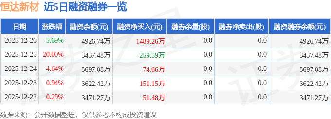 证券之星消息,截至2025年12月26日收盘,恒达新材(301469)报收于33.16元,下跌5.69%,换手率24.01%,成交量11.06万手,成交额3.64亿元。