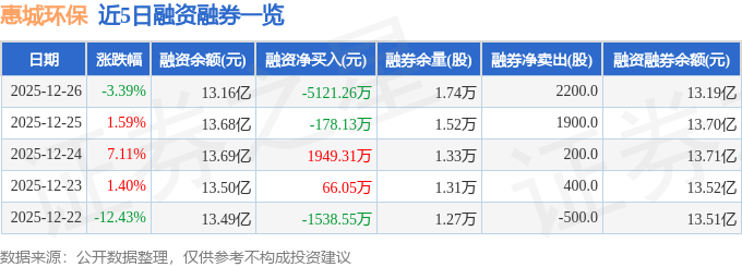 证券之星消息,截至2025年12月26日收盘,惠城环保(300779)报收于144.83元,下跌3.39%,换手率2.81%,成交量4.52万手,成交额6.55亿元。