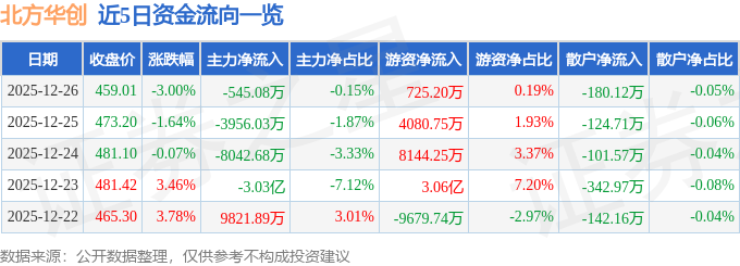 证券之星消息,截至2025年12月26日收盘,北方华创(002371)报收于459.01元,下跌3.0%,换手率1.12%,成交量8.11万手,成交额37.46亿元。