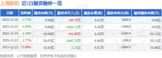 上海新阳融资融券信息显示,融资方面,当日融资买入9981.19万元,融资偿还9832.49万元,融资净买入148.7万元。融券方面,融券卖出4500.0股,融券偿还1900.0股,融券余量6.62万股,融券余额425.33万元。融资融券余额9.94亿元。