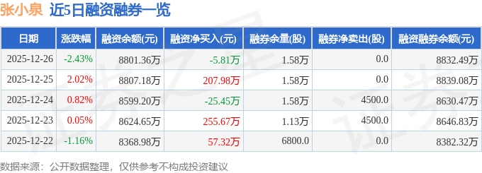 证券之星消息,截至2025年12月26日收盘,张小泉(301055)报收于19.7元,下跌2.43%,换手率1.07%,成交量1.67万手,成交额3318.82万元。