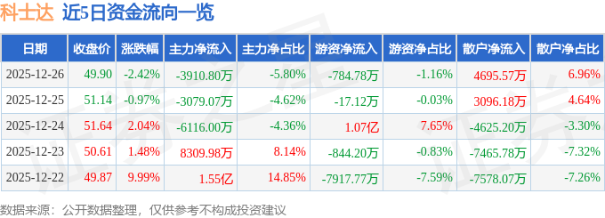 证券之星消息,截至2025年12月26日收盘,科士达(002518)报收于49.9元,下跌2.42%,换手率2.4%,成交量13.55万手,成交额6.74亿元。