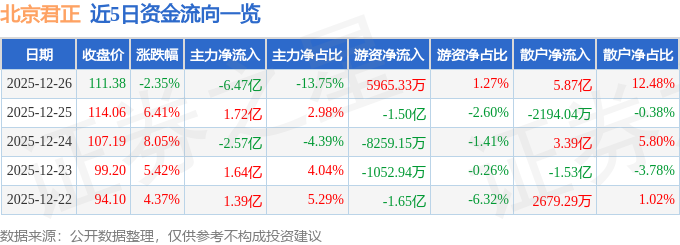 证券之星消息,截至2025年12月26日收盘,北京君正(300223)报收于111.38元,下跌2.35%,换手率9.87%,成交量41.51万手,成交额47.03亿元。