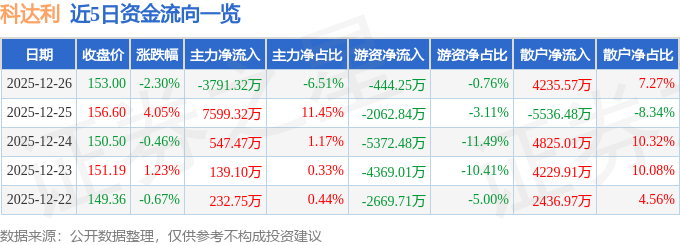 证券之星消息,截至2025年12月26日收盘,科达利(002850)报收于153.0元,下跌2.3%,换手率1.92%,成交量3.78万手,成交额5.83亿元。