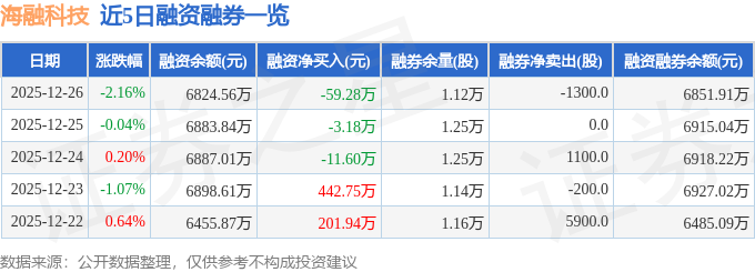 海融科技融资融券信息显示,融资方面,当日融资买入465.22万元,融资偿还524.49万元,融资净偿还59.28万元。融券方面,融券卖出0.0股,融券偿还1300.0股,融券余量1.12万股,融券余额27.35万元。融资融券余额6851.91万元。