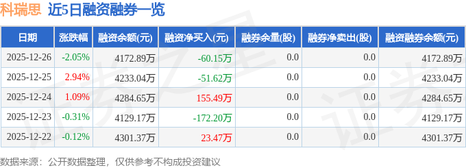 科瑞思融资融券信息显示,融资方面,当日融资买入271.34万元,融资偿还331.49万元,融资净偿还60.15万元。融券方面,融券卖出0.0股,融券偿还0.0股,融券余量0.0股,融券余额0.0万元。融资融券余额4172.89万元。