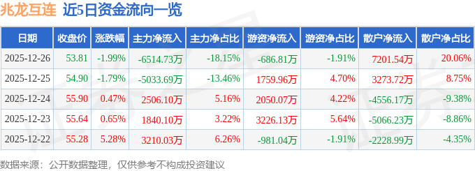 12月26日的资金流向数据方面,主力资金净流出6514.73万元,占总成交额18.15%,游资资金净流出686.81万元,占总成交额1.91%,散户资金净流入7201.54万元,占总成交额20.06%。