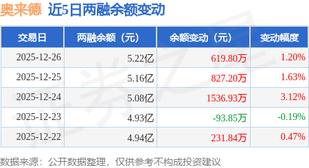 证券之星消息,12月26日,奥来德(688378)融资买入3043.82万元,融资偿还2423.43万元,融资净买入620.39万元,融资余额5.22亿元,近3个交易日已连续净买入累计2989.59万元,近20个交易日中有11个交易日出现融资净买入。