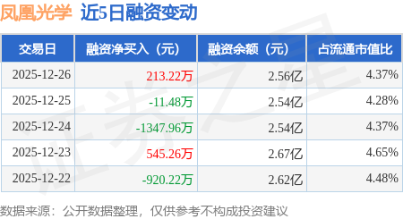 证券之星消息,12月26日,凤凰光学(600071)融资买入1324.75万元,融资偿还1111.53万元,融资净买入213.22万元,融资余额2.56亿元。