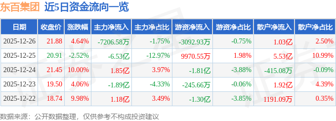 12月26日的资金流向数据方面,主力资金净流出7206.58万元,占总成交额1.75%,游资资金净流出3092.93万元,占总成交额0.75%,散户资金净流入1.03亿元,占总成交额2.5%。