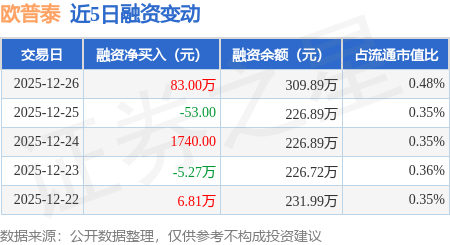 证券之星消息,12月26日,欧普泰(920414)融资买入84.2万元,融资偿还1.2万元,融资净买入83.0万元,融资余额309.89万元。