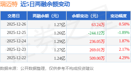 证券之星消息,12月26日,瑞迈特(301367)融资买入589.59万元,融资偿还525.76万元,融资净买入63.83万元,融资余额1.26亿元,近20个交易日中有13个交易日出现融资净买入。