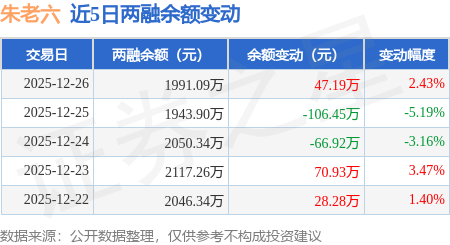 证券之星消息,12月26日,朱老六(920726)融资买入418.33万元,融资偿还371.14万元,融资净买入47.19万元,融资余额1991.09万元。