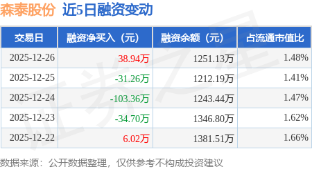 证券之星消息,12月26日,森泰股份(301429)融资买入151.05万元,融资偿还112.11万元,融资净买入38.94万元,融资余额1251.13万元。