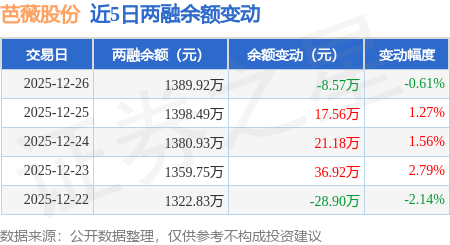 证券之星消息,12月26日,芭薇股份(920123)融资买入107.32万元,融资偿还115.89万元,融资净卖出8.57万元,融资余额1389.92万元。